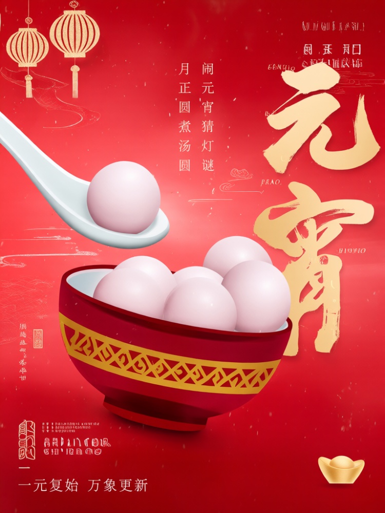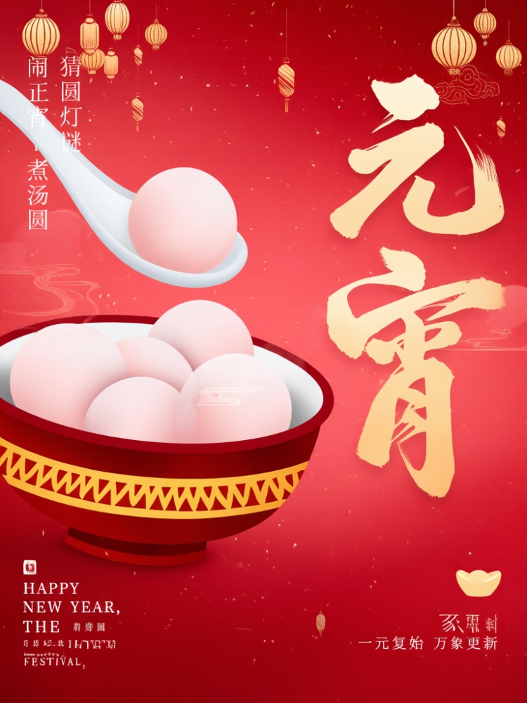 典型元素:各式花灯(宫灯、走马灯、兔子灯)、璀璨烟花、圆月。灯谜笺、舞龙舞狮队伍、踩高跷、划旱船。汤圆/元宵(寓意团圆美满)。色彩:以喜庆的中国红为主,搭配温暖的金黄(灯火色)与夜空的深蓝。