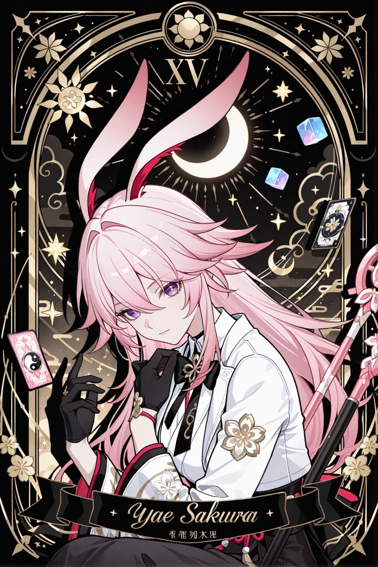 Evanescia \(Honkai: Star Rail\),yae sakura,clothes: white shirt and black skirt,1girl,bangs,long sleeves,bow,long animal ears,pink hair,boots,japanese clothes,black gloves,bowtie,black footwear,high heels,fox ears,white jacket,purple eyes,