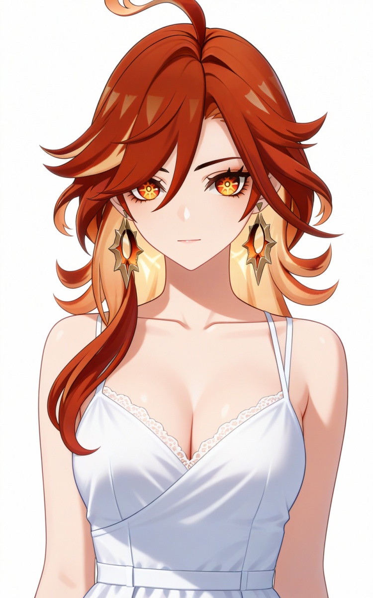 mavuika_(genshin_impact), ahoge, red hair, multicolored hair, two-tone hair, streaked hair, blonde hair, long hair, hair between eyes, red eyes, eyelashes, multi-colored eyes, orange eyes, symbol-shaped pupils, star-shaped pupils, makeup, earrings