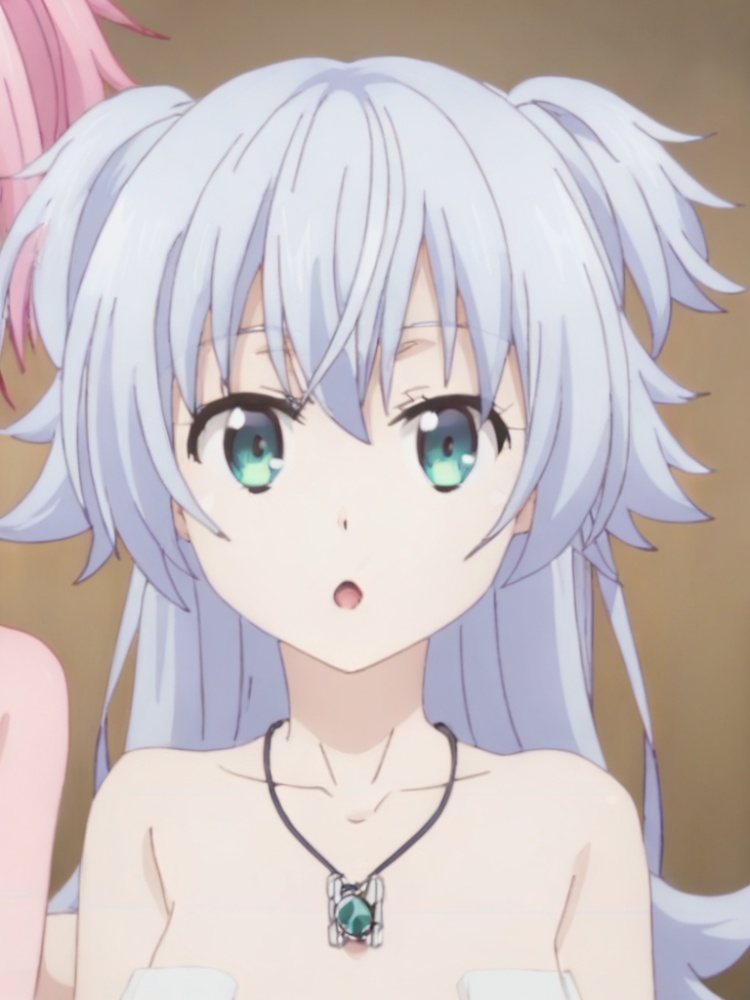 画风很好看的一部番,小宙可爱捏。1girl, solo, long hair, looking at viewer, open mouth, blue eyes, jewelry, blue hair, collarbone, upper body, white hair, nude, necklace, convenient censoring