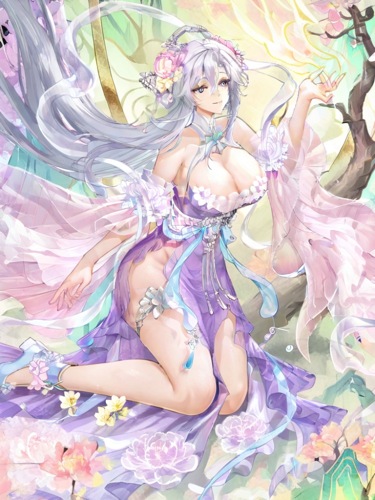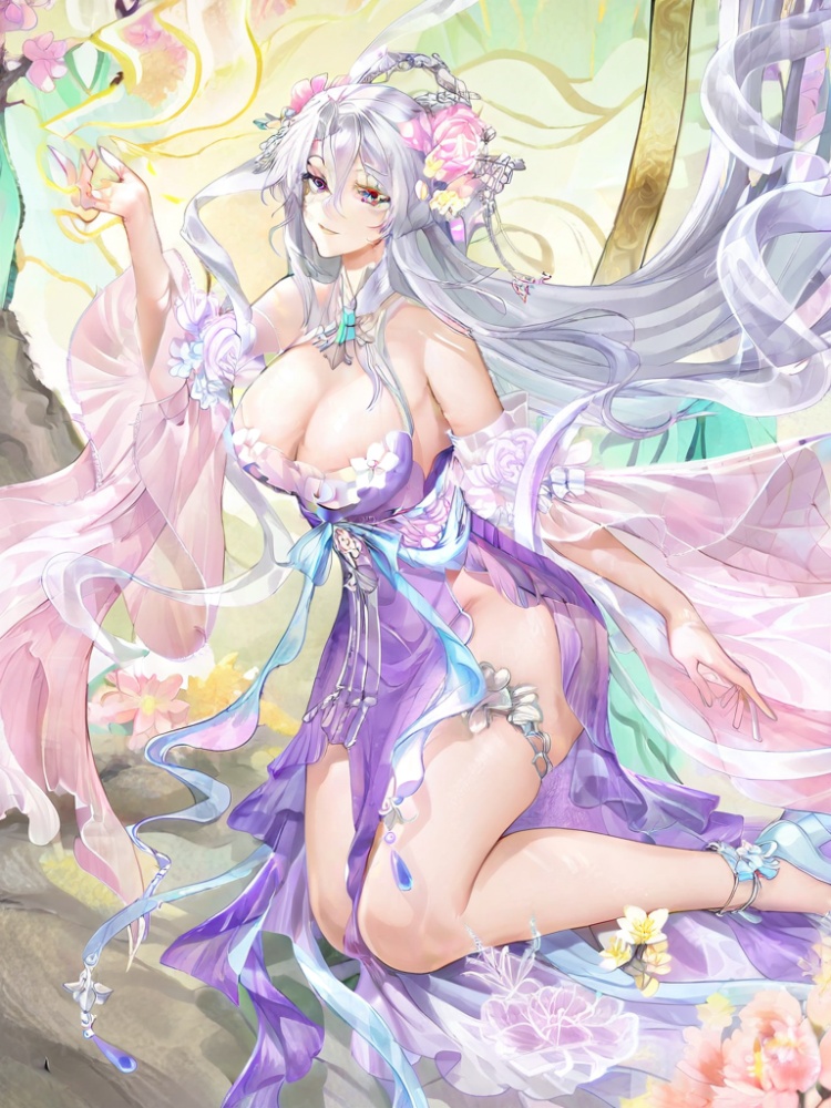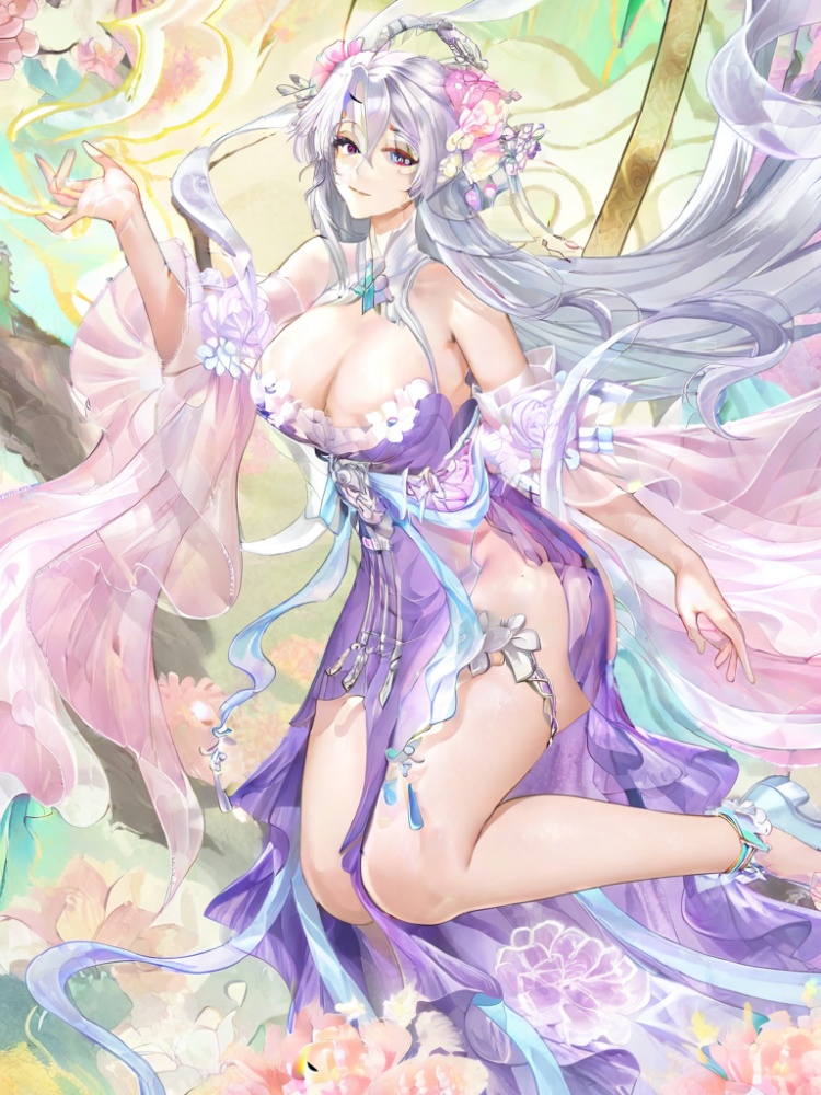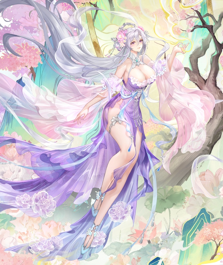 yinhe, 1girl, solo, long hair, bangs, large breasts, hair ornament, cleavage, bare shoulders, jewelry, very long hair, purple eyes, flower, white hair, detached sleeves, hand up, hair flower, bare legs, floating hair, purple dress, side slit, floating shawl, official alternate costume, floral print, chinese clothes, hair between eyes, tiara, hair rings, hair stick, wide sleevess, blue shoes, thighlet, belt, flower trim, see-through,