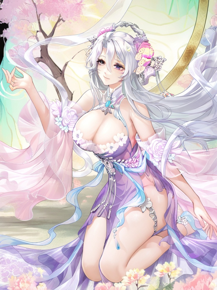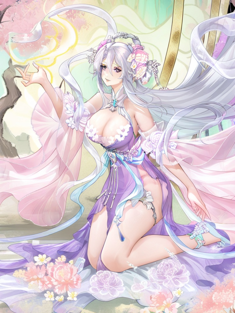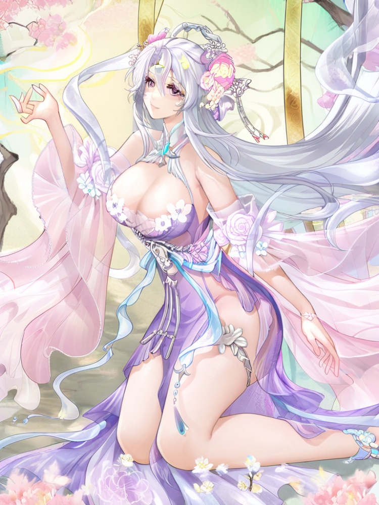 yinhe, 1girl, solo, long hair, bangs, large breasts, hair ornament, cleavage, bare shoulders, jewelry, very long hair, purple eyes, flower, white hair, detached sleeves, hand up, hair flower, bare legs, floating hair, purple dress, side slit, floating shawl, official alternate costume, floral print, chinese clothes, hair between eyes, tiara, hair rings, hair stick, wide sleevess, blue shoes, thighlet,ribbon belt, flower trim, see-through,