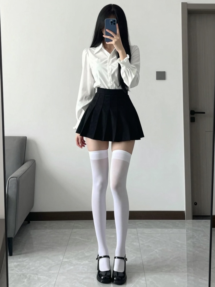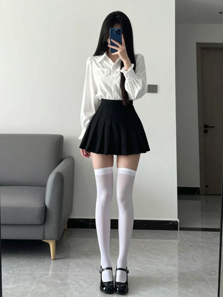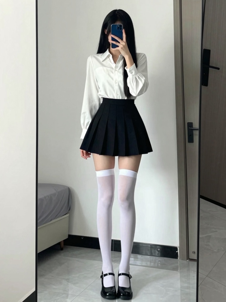 YLD-260301-5,Photograph of a young woman taking a mirror selfie in a modern, minimalist room. She has long, straight black hair and is wearing a white, long-sleeved, button-up blouse with ruffled cuffs and a black, pleated mini-skirt. Her legs are adorned with white, thigh-high stockings, and she is wearing black, Mary Jane-style shoes with a small heel. She is holding a smartphone with a blue case in front of her face, partially obscuring it. The room has light gray tiled flooring and white walls, with a partially visible door on the right and a bed with gray bedding in the background. The lighting is natural, coming from an unseen source, and the overall composition is clean and simple. The woman's skin tone is fair, and she has a slender, curvy physique.