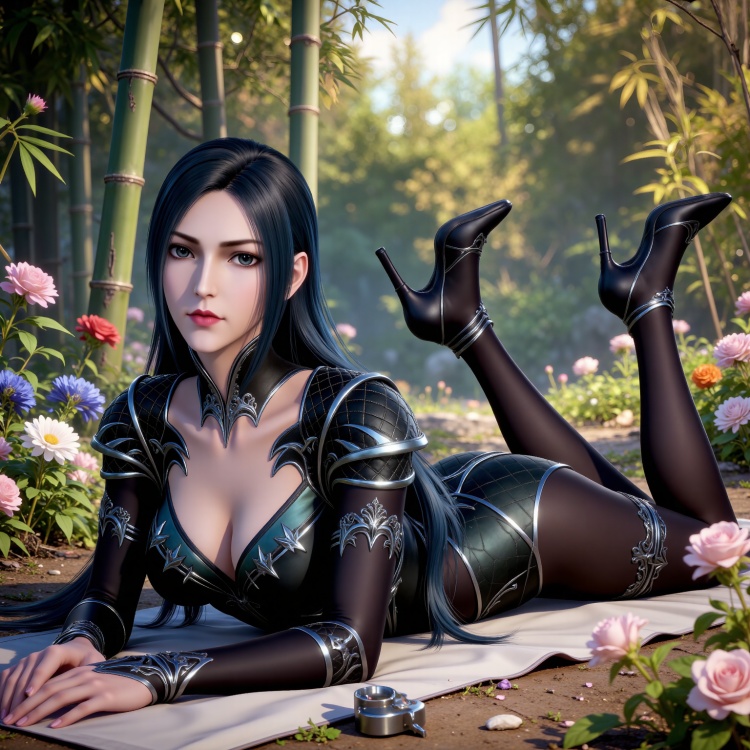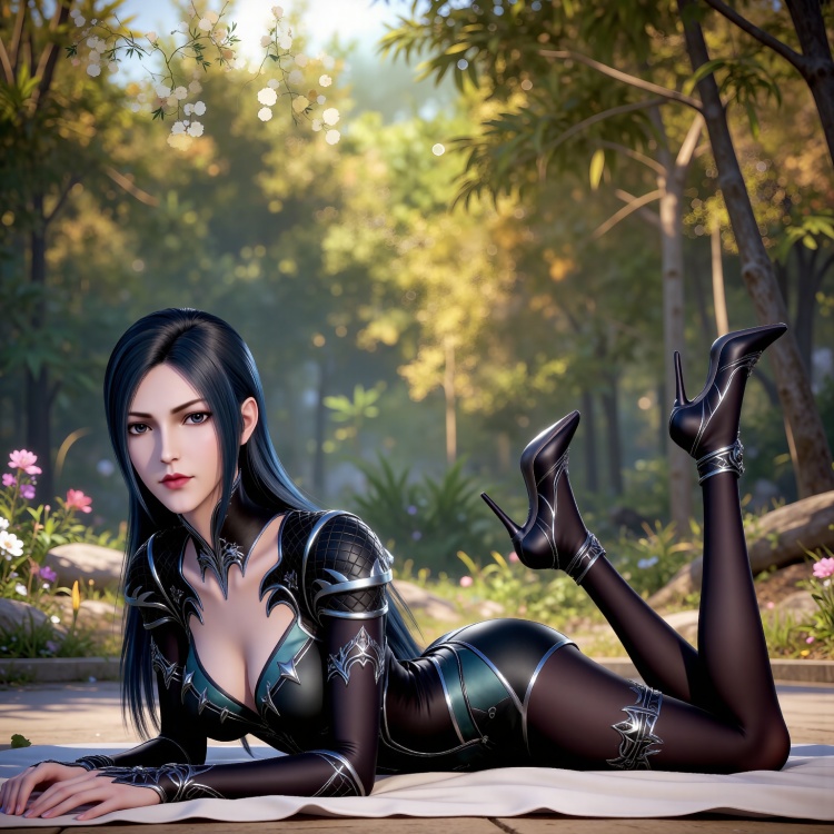 基础提示词:black hair, long hair, black eyes, liuerlong black leotard, cleavage cutout, shoulder armor, black pantyhose, high_heels