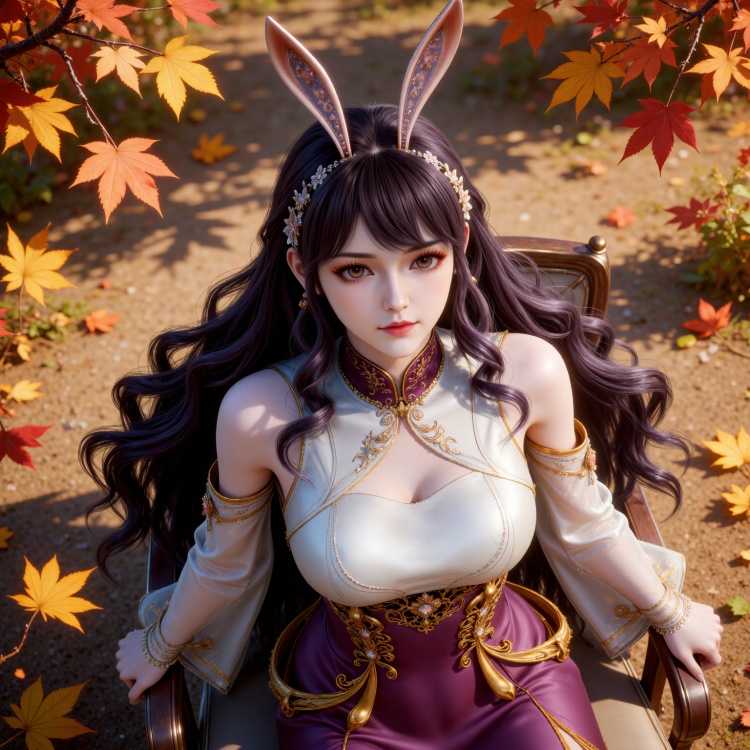 人物基础提示词:black hair, long hair, very long hair, wavy hair, brown eyes, large breasts, hair_ornament, hairband, fake animal ears, rabbit ears, bare shoulders, jiangnannan white shirt, cleavage cutout, detached_sleeves, see-through_sleeves, long_sleeves, jiangnannan purple high waist skirt, single thighhigh, fishnet thighhighs, see-through_thighhighs, high_heels, gold footwear