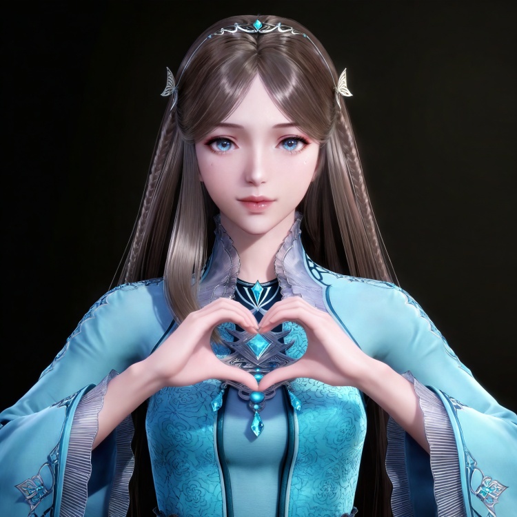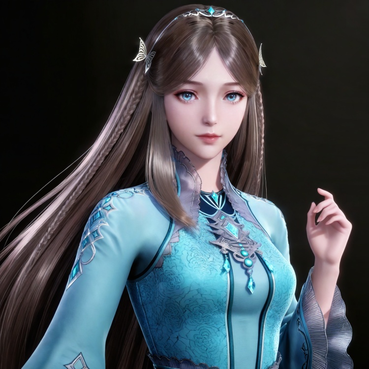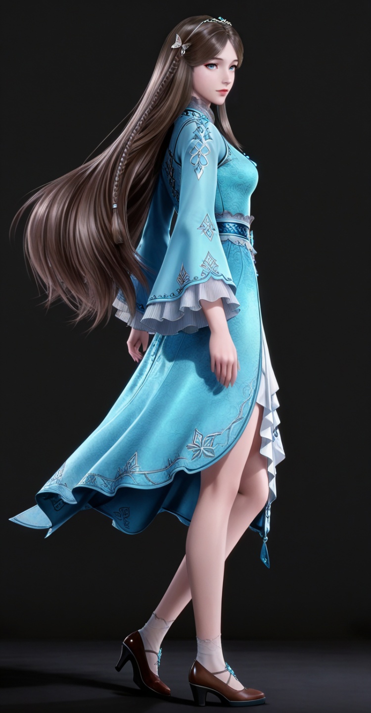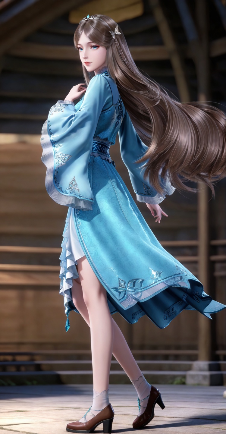 人物基础提示词:brown hair, long hair, blue eyes, very long hair, tiara, ningrongrong blue dress, butterfly hair ornament, braid, long_sleeves, wide_sleeves, bare legs, white socks, high_heels,