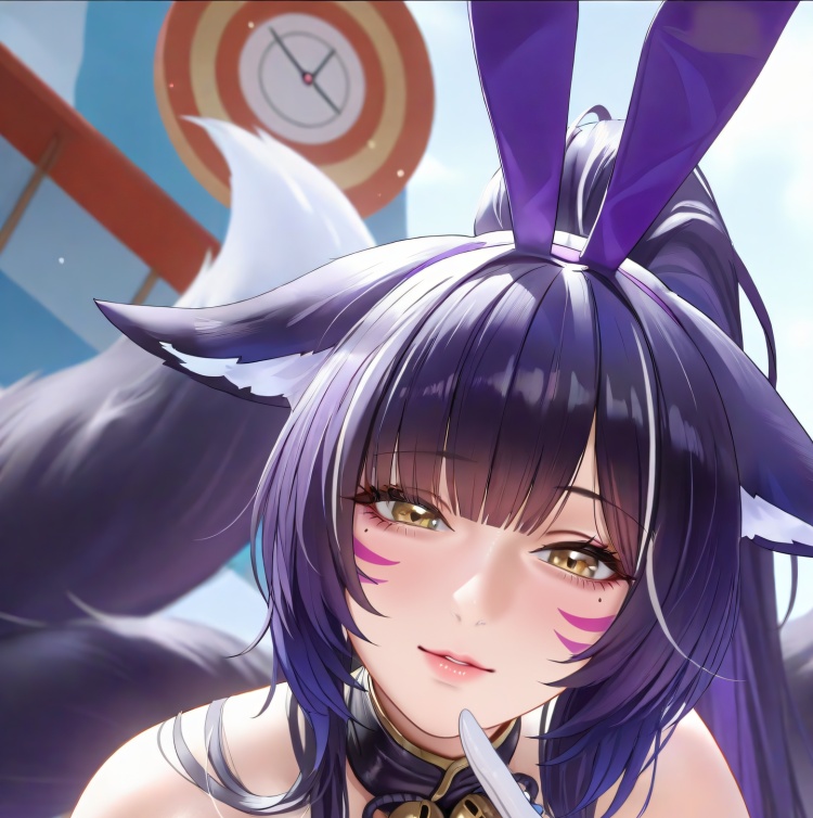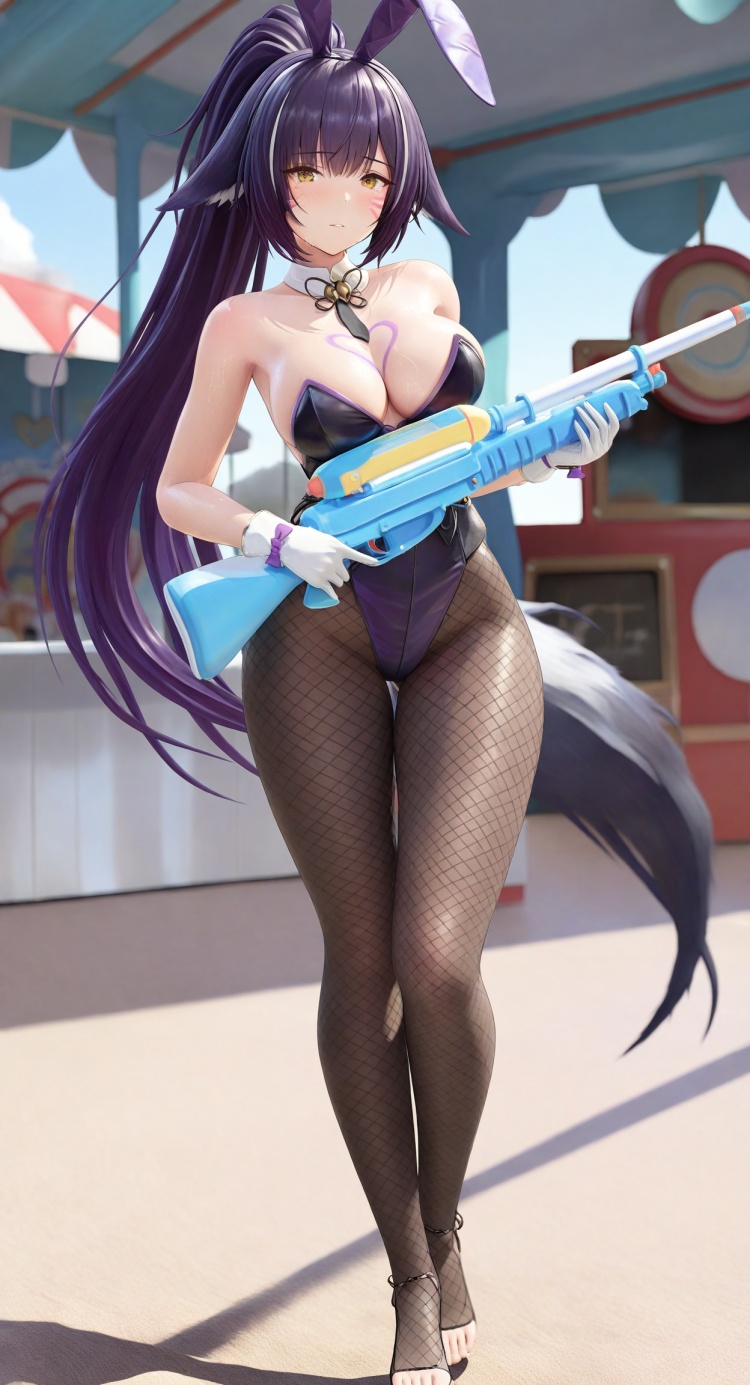 [musashi \(the purple rabbit's marksmanship\):0.2],purple hair,very long hair, yellow eyes, ponytail,high ponytail,facial mark,whisker markings 为人物的脸和头发相关的prompt, 其中facial mark,whisker markings控制脸部的胡须图案animal ears, playboy bunny, fake animal ears,rabbit ears,fox tail, fox girl, tail,white gloves,bare shoulders,highleg leotard, detached collar, magatama, strapless leotard,purple leotard, strapless,heart tattoo, chest tattoo,heart 为控制人物服饰的prompt,其中heart tattoo, chest tattoo,heart控制人物的胸口的爱心图案fishnets,fishnet pantyhose,pantyhose under pantyhose, black pantyhose, toeless legwear, stirrup legwear 为控制人物的裤袜的prompt,不加控制裤袜的提示词就是光腿,fishnets,fishnet pantyhose,pantyhose under pantyhose, black pantyhose 生成叠丝袜,网袜下会有黑色裤袜,toeless legwear, stirrup legwear控制裤袜是否是露趾。下层的裤袜有black pantyhose和brown pantyhose两种选择,brown的裤袜颜色会比black的浅holding,water gun,shooting gallery, amusement park, 为控制其它设定的prompt,其中holding,water gun,控制是否手持水枪,shooting gallery, amusement park 控制背景是否为游乐园建议出图分辨率:1024*1536