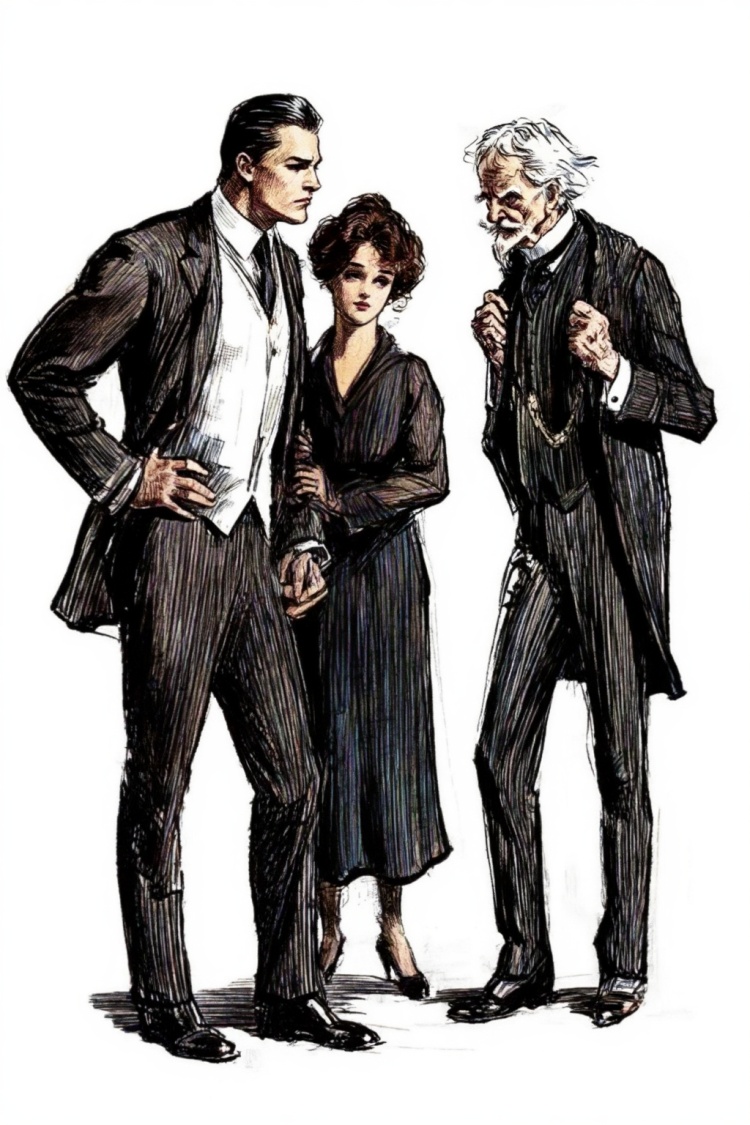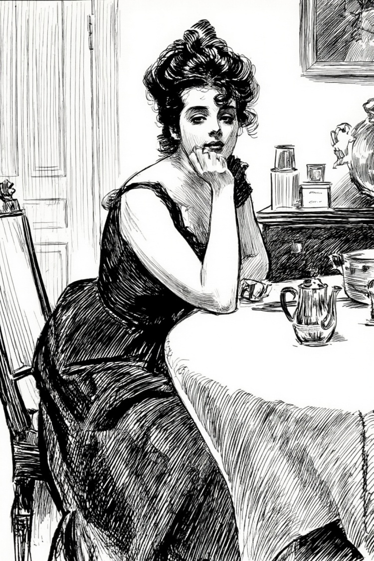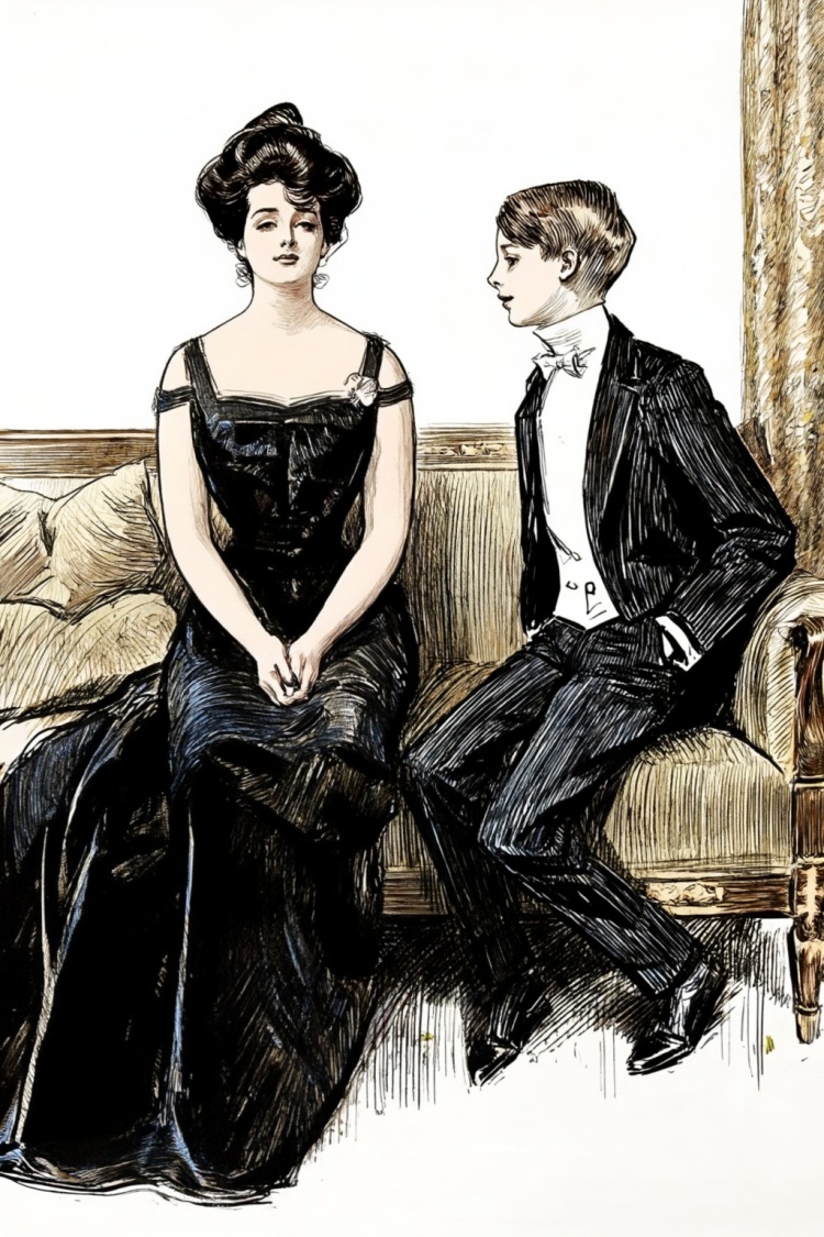 Prompts:charlesdgibson3z monochrome illustration. A man and a woman are seated on a simple, upholstered couch or chair with a subtle pattern indicated by faint, curved lines. On the left, a man sits with his arms crossed, looking contemplative or slightly bored. On the right is a woman wearing an evening gown. She sits with her hands on her lap and is looking directly at the viewer.