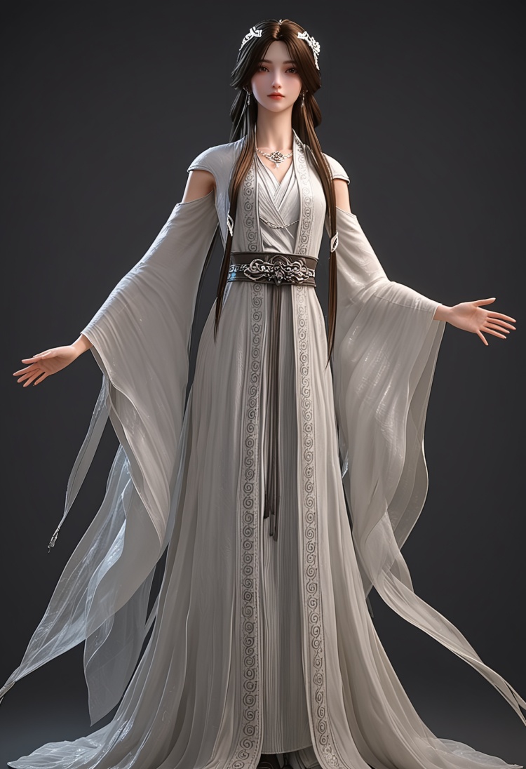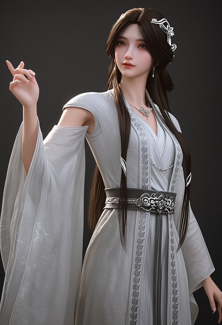 <lora:YQ_pony_yuxin2.0_V4:0.8>,q1528437228,1girl,solo,long hair,hair ornament,jewelry,earrings,dress,brown hair,white dress,necklace,black hair,brown eyes,chinese clothes,long sleeves,detached sleeves,wide sleeves,hair bun,