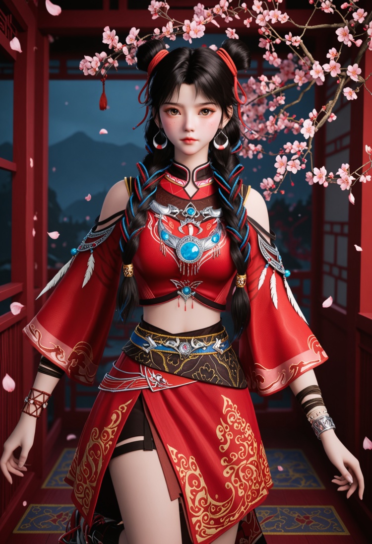 q1528437228,solo,1girl,jewelry,black hair,long hair,earrings,hair bun,braid,ribbon,hair ribbon,twin braids,double bun,brown eyes,chinese clothes,multiple braids,bracelet,crop top,skirt,multicolored hair,feathers,dress,red ribbon,red skirt,single hair bun,red dress,hair over shoulder,leg warmers,socks,shirt,brown hair,red shirt,necklace,freckles,shoes,long sleeves,detached sleeves,hair ornament,china dress,black eyes,multi-tied hair,wide sleeves,ribbon braid,black footwear,