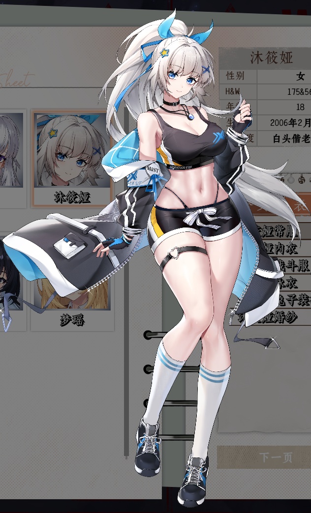 lxmxy,white hair,blue eyes,ponytail,hair between eyes,hairclip,hair ribbon,blue ribbon,choker,necklace,fingerless gloves,black jacket,,black sleeveless shirt,black shorts,thigh strap,white socks,black sneakers
