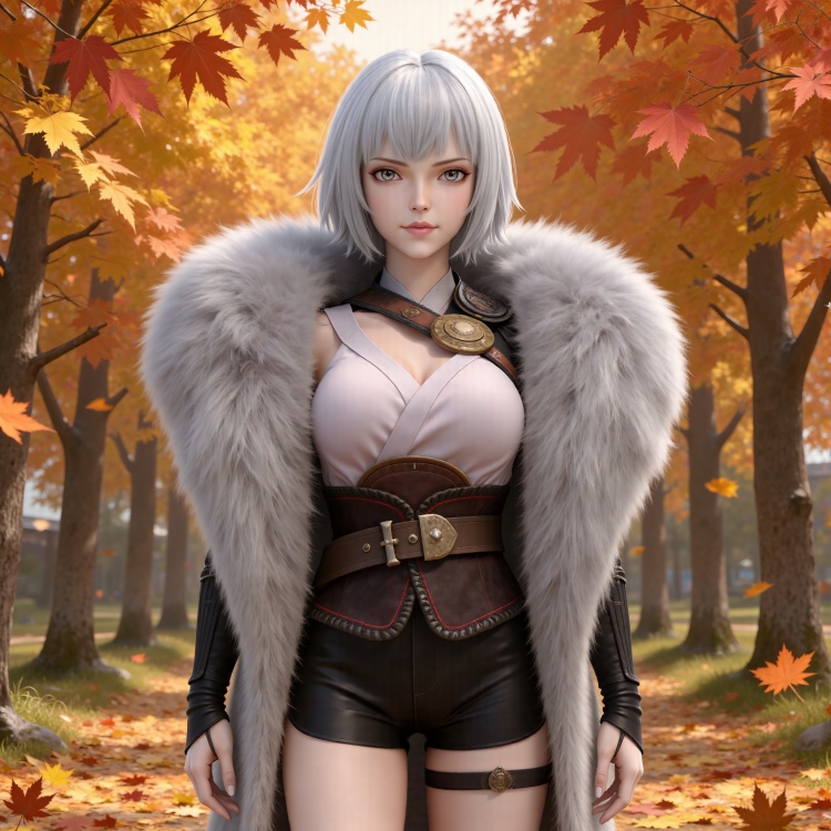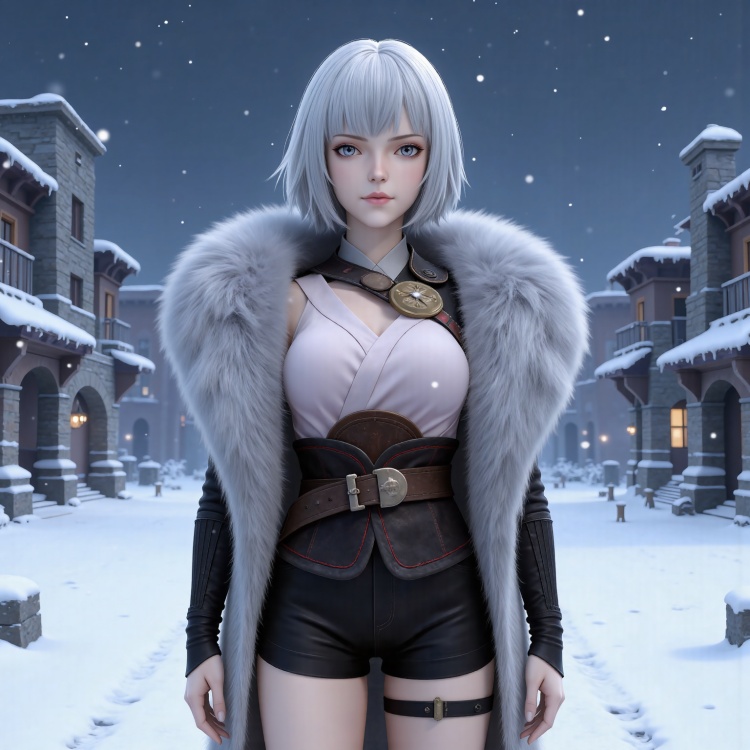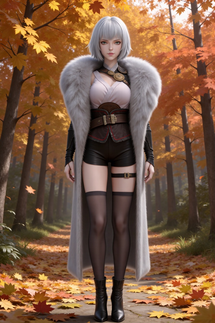 人物基础提示词:white hair, short hair, grey eyes, fur coat, shirt, detached_sleeves, black shorts, black_thighhighs, high_heel_boots,