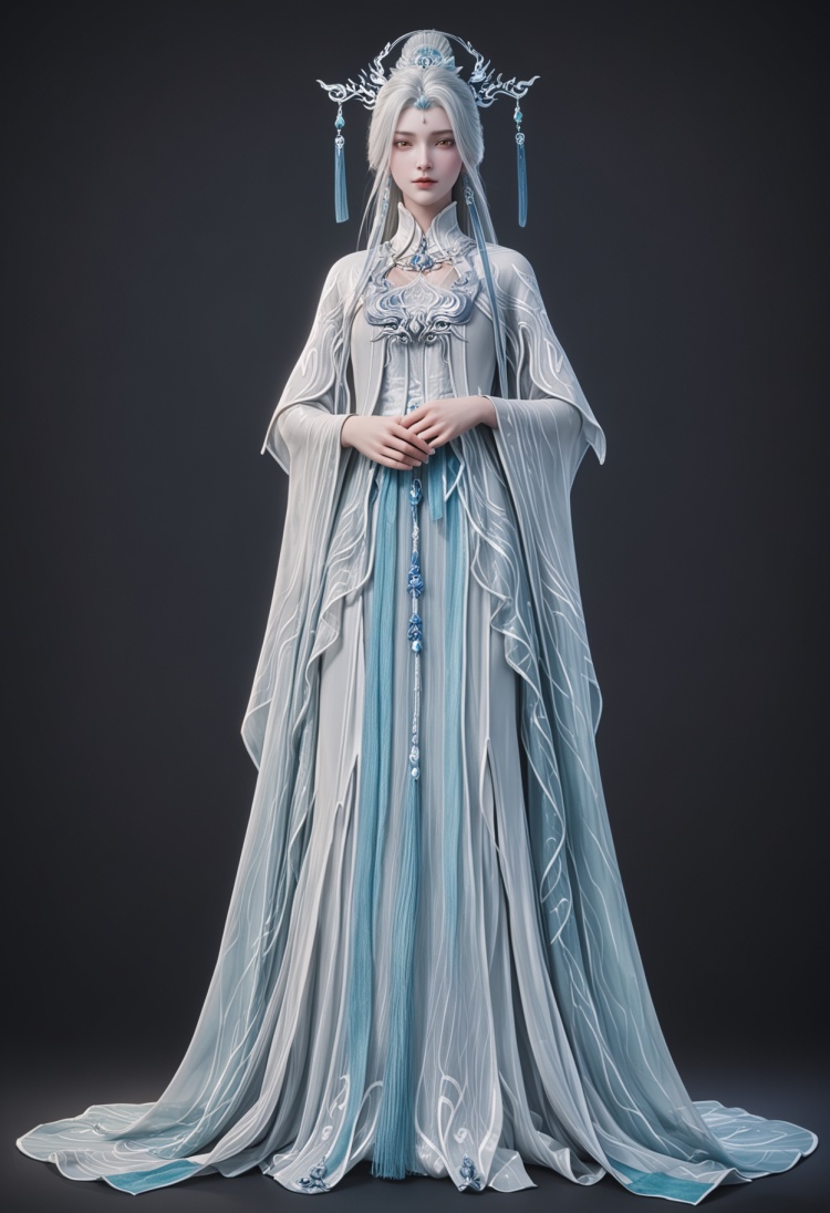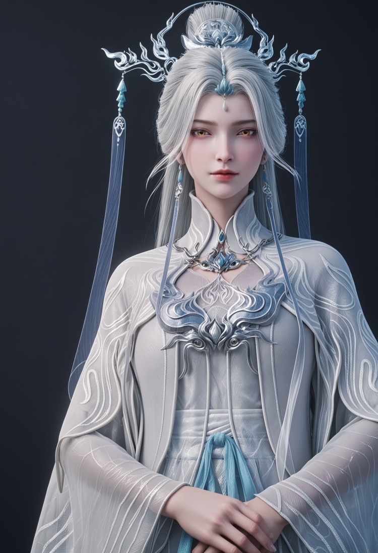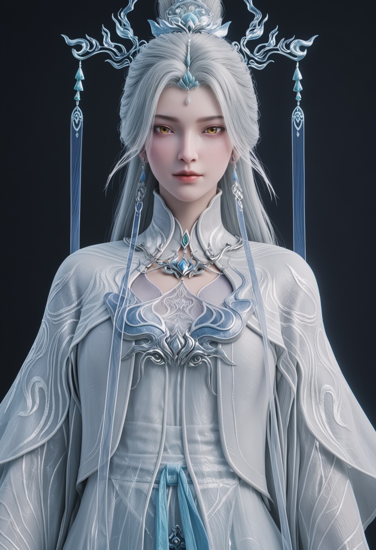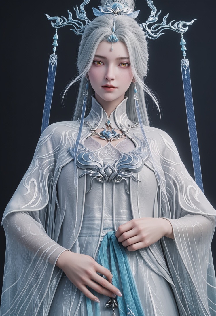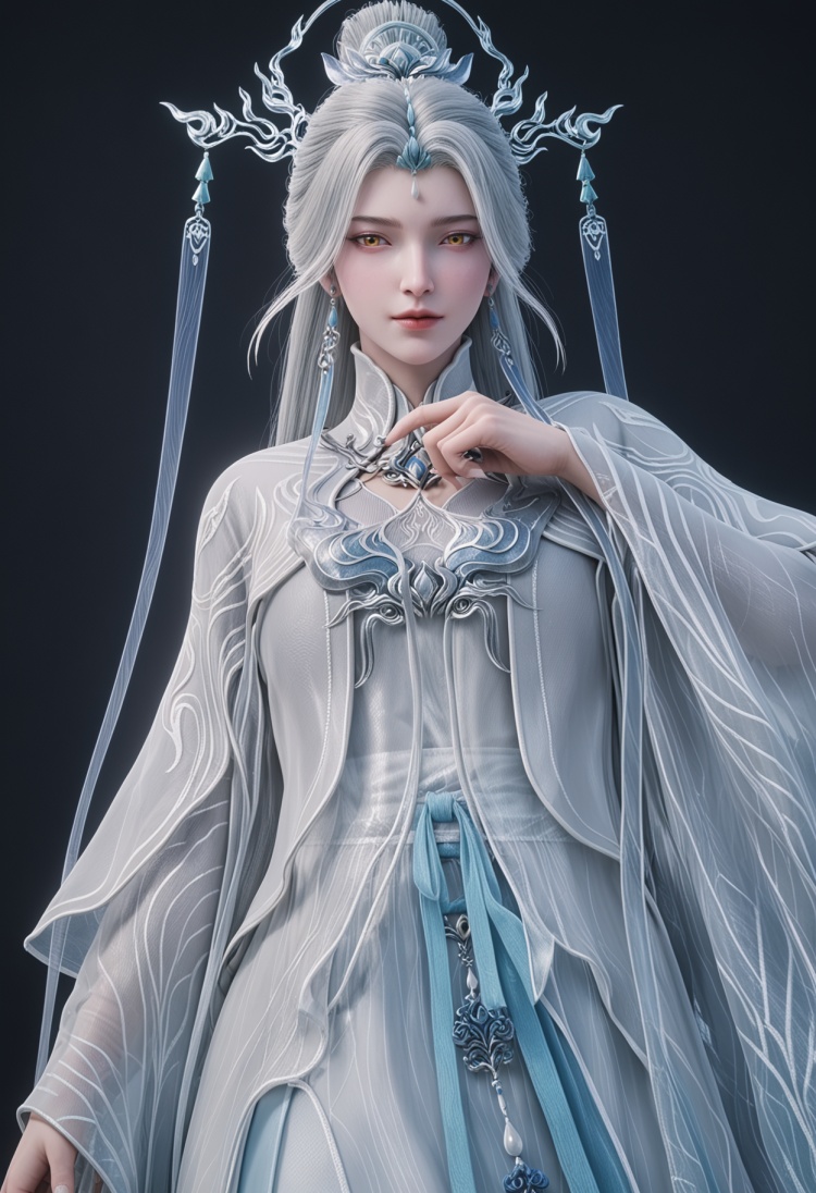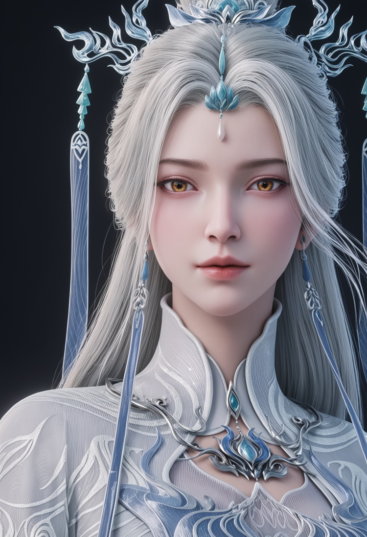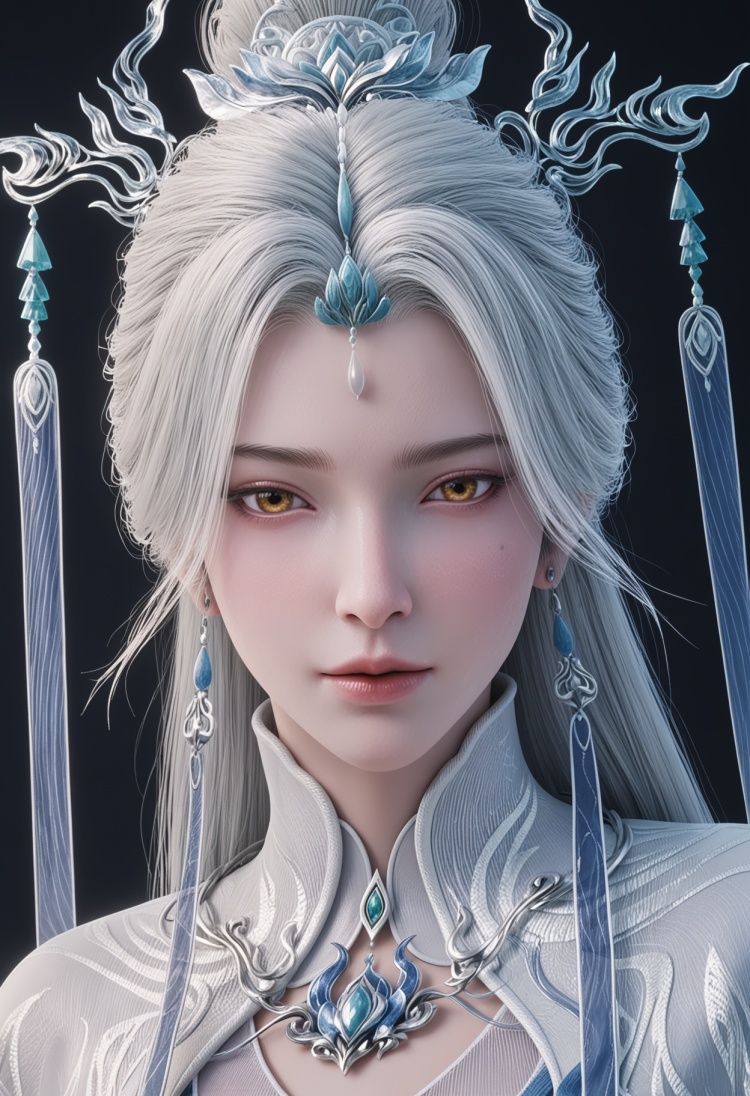 <lora:YQ_pony_jianma_fuzhuang2_V4:0.8>,q1528437228,solo,1girl,white hair,long hair,jewelry,hair ornament,earrings,hair bun,chinese clothes,dress,long sleeves,white dress,yellow eyes,wide sleeves,forehead mark,brown eyes,robe,single hair bun,tassel,facial mark,