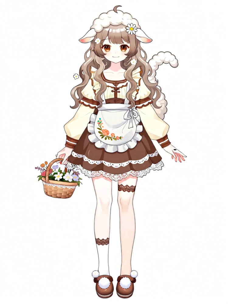 XNXX, A young female-presenting VTuber character with long, curly light brown hair and fluffy white sheep ears wears a cream-and-brown pastoral outfit: a frilled cream top with brown trim, a puffy brown skirt with white lace, and a white apron with floral embroidery. She has soft brown eyes, a gentle smile, and a small white sheep tail. Her one hand holds a wicker basket of flowers, while the other rests gently at her side; she wears white thigh-high stockings with brown lace trim and brown clogs with white pom-poms. A white sheep ear headband with a daisy ornament sits atop her hair, which is decorated with small white flower hair clips.