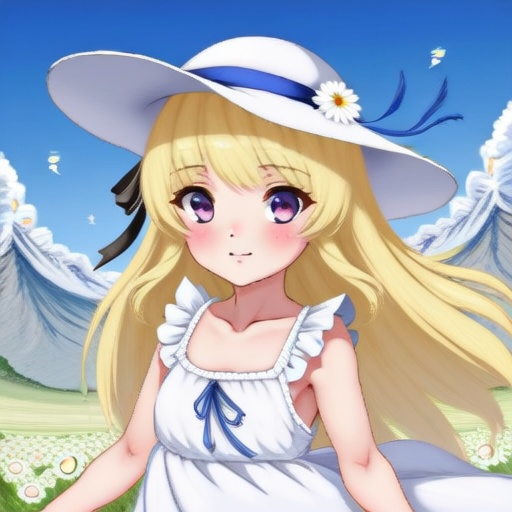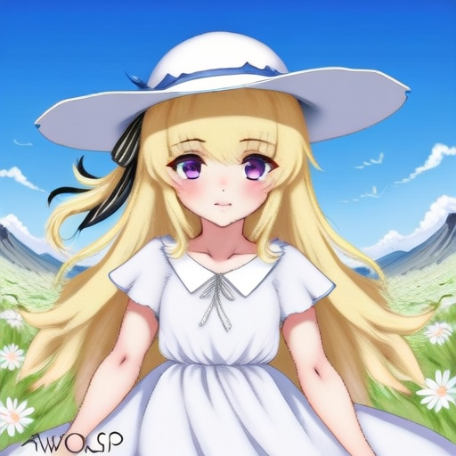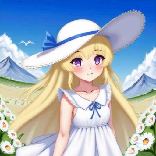 Phoebe\(wuthering waves\),hycg,1girl,solo,long hair,looking at viewer,smile,hair ornament,dress,collarbone,upper body,flower,white dress,head tilt,sleeveless dress,white flower,(Tyndall Effect 1.4),(wlop:0.6),((artist:reoen),(artist:fuzichoco),(artist:atdan),(artist:torino_aqua),year 2024:0.8),[artist:wlop],[artist:ningen_mame],artist:ciloranko,[[artist:rhasta]],artist:tidsean,colorful,best quality,very aesthetic,absurdres,32K UHD,sharp focus,best-quality,Emotionalization,temperate atmosphere,with a high-end texture,in the style of fashion photography,Dynamic,dynamic force picture,(Visual impact:1.2),impactful picture,offcial art,blonde hair,hat,ribbon,closed mouth,purple eyes,white headwear,