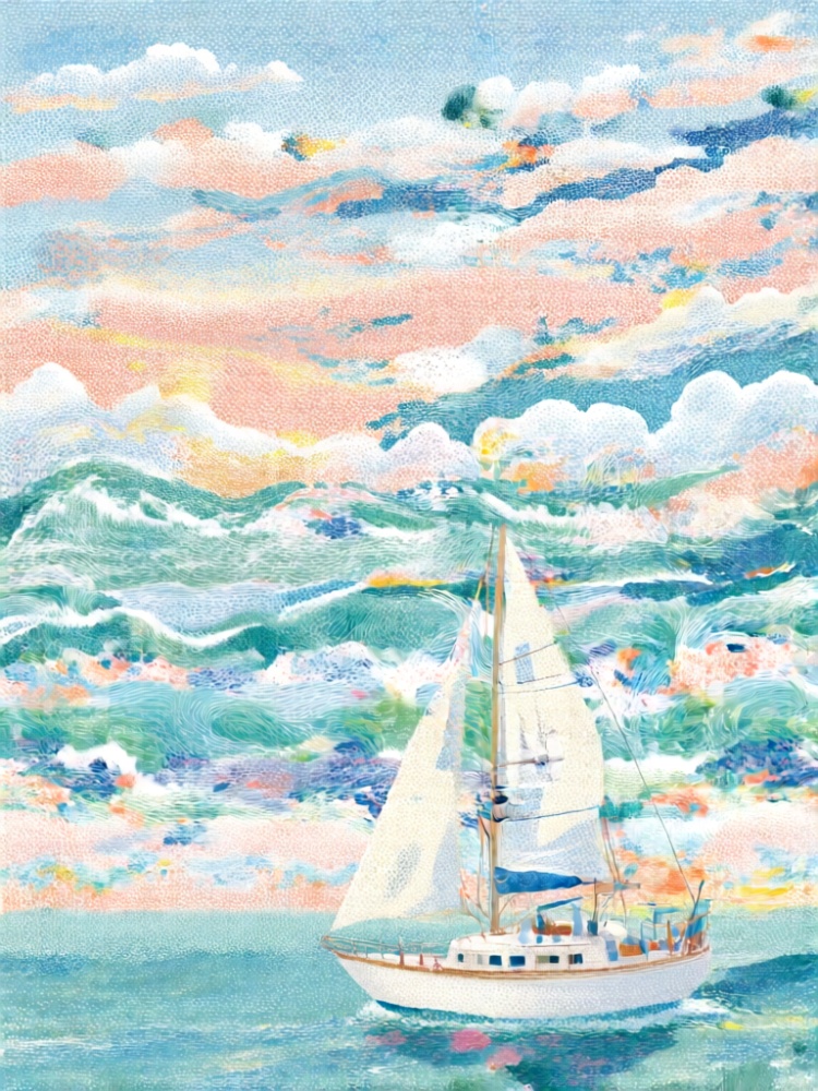DCJL, 白帆船行于画面下半部分,船身与帆面以米白、浅蓝点阵塑造,上方以点彩肌理铺陈海浪与霞光,橘粉、湖蓝点阵堆叠出水波与流云,纯靠色点密度表现光影,清新海调澄澈治愈,简约帆船与灵动点彩海景相融,传递自由悠然的氛围。