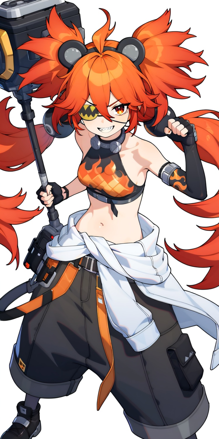 zenless-zone-zero, Koleda_Belobog, Koleda Belobog, Koleda_Belobog_(zenless_zone_zero), Koleda Belobog (zenless zone zero), Koleda_Belobog_\(zenless_zone_zero\), Koleda Belobog \(zenless zone zero\), zenless_zone_zero, zenless zone zero, 1girl, solo, twintails, long hair, gloves, holding, simple background, animal ears, smile, white background, eyepatch, black footwear, navel, red eyes, orange hair, elbow gloves, ahoge, grin, hammer, black gloves, fingerless gloves, teeth, clothes around waist, very long hair, belt
