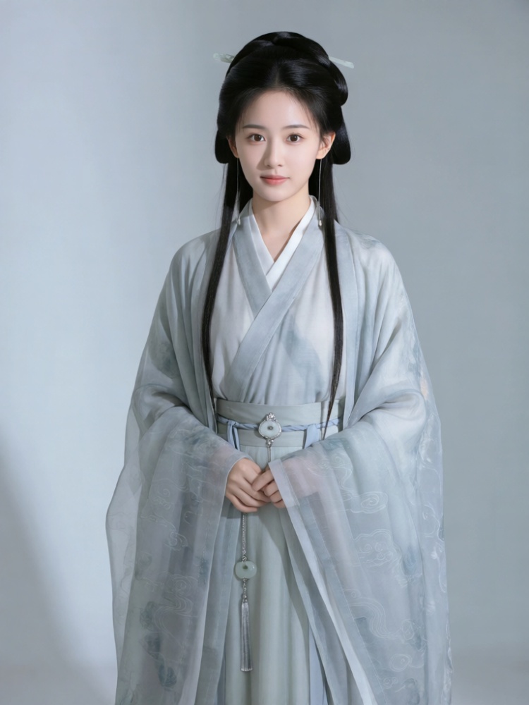DJYS, 短剧影视人像质感,青丝挽髻的古装少女立于纯浅灰极简影棚中央,目光温婉沉静,身着交领素色襦裙,外搭薄纱云纹披风,腰间系素银玉佩,正面柔光均匀铺展,弱化阴影凸显衣物质感与面部轮廓,背景干净无杂,整体氛围清雅温婉,人物主体视觉焦点突出