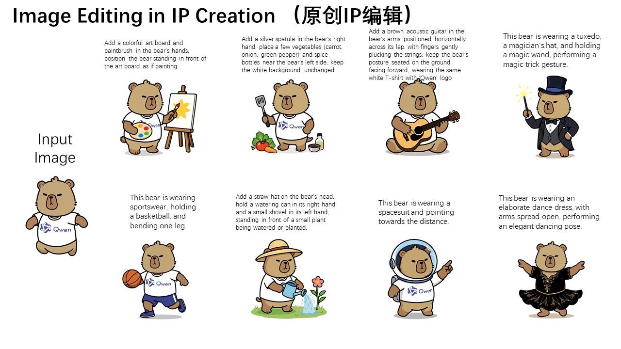 语义与外观双重编辑: Qwen-Image-Edit不仅⽀持low-level的视觉外观编辑(如元素的添加、删除、修改等,要求图片其他区域完全不变),也支持 high-level 的视觉语义编辑(如 IP 创作、物体旋转、风格迁移等,允许整体像素变化但保持语义一致)。