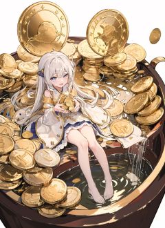 hentai,1girl,solo,loli,aged down,Exquisite and complex gold coins,(a hill of gold coins:1.2),(Gold coin fountain:1.2),Simple background,White background,