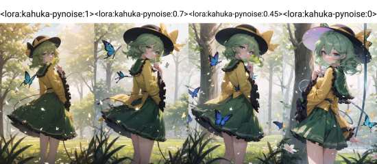 kahuka1, komeiji koishi, solo, bug, hat, butterfly, yellow shirt, green skirt, long sleeves, black headwear, looking at viewer, third eye, green hair, bow, shirt, looking back, skirt, hat bow, long hair, index finger raised, parted lips, yellow bow, finger to mouth, wide sleeves, bangs, frilled sleeves, outdoors, from behind, light rays, frills, flower, sunlight, grass, hand up, blue butterfly, green eyes, blue eyes, ribbon, frilled shirt collar, light particles, petals, hair between eyes, nature, medium hair, hat ribbon, standing, black bow, tree <lora:kahuka-pynoise:1>