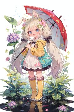 1girl,rainbow,raincoat,yellow raincoat,rubber boots,hydrangea,flower,long hair,twintails,boots,blush,umbrella,open mouth,hair ornament,white background,hood,solo,teruterubouzu,very long hair,hood up,long sleeves,low twintails,bow,bangs,smile,animal hood,blue eyes,rabbit,closed umbrella,puddle,full body,:d,snail,yellow footwear,simple background,pink flower,standing,leaf umbrella,holding umbrella,food-themed hair ornament,hair bow,animal ears,holding,blonde hair,hair flower,rain,animal, <lora:normal_cute:1>