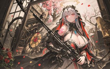 ((masterpiece:1.4, best quality))+, (ultra detailed)+,(steampunkai:0.8), (Maximalism:1.8), vivid contrast, Gustav Klimt, Gustave Moreau,BREAK(realistic:1.3), super photo realistic illustration, highres, ultla detailed, absurdres, (from side:1.3),extremely beautiful machine goddess (holding many guns:1.5), (Zentangle:1.5), (angel halo:1.5),(detailed machine body with glowing lights:1.5), (attached huge machines, attached huge guns:1.5),(detailed mechanical arms, detailed mechanical legs:1.3),(detailed mechanical many wings, musket rifles, heavy weapons:1.8), (large magic circles around:1.8),ultra detailed beautiful face and eye, (tattoos, painted body:1.5),white hair, red eyes,(wearing detailed mechanical dress with many large gears and jewelries and frills, detailed mechanical white veil:1.5),BREAK(god bless you:1.3),compassionate expression, empathetic, caring, kind,content expression, satisfied, pleased, gratified,thoughtful expression, pensive, reflective, contemplative,determined expression, resolute, purposeful, firm,BREAKwhite background,(collapsed machine chapel, cathedral ruin, stained glass, many magic circles:1.3),fine sky, rainbow, colorful clouds in the sky,many machines, many gears, broken machines, cables,(mechanical angels in sky with trumpets:1.2),(big tree:1.5), tree root, tree branch, blood vessel, vein,(colorful flowers:1.5), (jewelries, chains:1.5),heavy rain, water drop, water ripple, cropped fabrics,BREAK(colorful:1.5), glowing lights, pillar of lights, blooming light effect,papier colle, paper collage, layered compositions, varied textures, abstract designs, artistic juxtapositions, mixed-media approach,(Zentangle:1.5), structured patterns, meditative drawing, intricate designs, focus and relaxation, creative doodling, artistic expression,