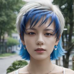 1girl, solo, jewelry, earrings, blurry background, looking at viewer, multicolored hair, blurry, shirt, short hair, white hair, upper body, realistic, blue shirt, collared shirt, blue hair, black eyes, bangs, two-tone hair, lips, outdoors, closed mouth, depth of field, buttons, streaked hair, <lora:zhao_20230615103520:0.8>
