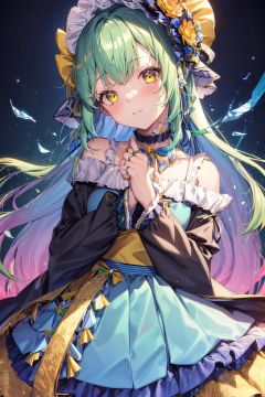 1girl, solo, green hair, looking at viewer, flower, blush, hair between eyes, green eyes, choker, red flower, closed mouth, frills, long sleeves, rose, bangs, long hair, upper body, wide sleeves, collarbone, hat, bonnet, red rose, japanese clothes, holding, sash, ribbon, kimono, jewelry, sidelocks, yellow eyes, obi, gem, blue headwear, virtual youtuber, frilled sleeves, brooch, multicolored background, frilled choker, black choker, shirt, bow, blue choker, green kimono, crossed bangs, neck ribbon, hands up, frilled collar, see-through, yellow flower, blue hair, striped, multicolored clothes, ring, head tilt, blue ribbon, dress