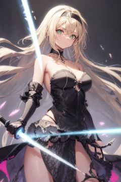 1girl, solo, blonde hair, long hair, green eyes, dress, weapon, detached sleeves, arms up, black dress, sword, armpits, looking at viewer, breasts, hair between eyes, parted lips, medium breasts, holding weapon, magic, detached collar, very long hair, copyright name, holding, bare shoulders, standing, holding sword, glowing weapon, grey background, gradient hair, long sleeves, glowing, multicolored hair, bangs, cleavage, strapless, cowboy shot, frills, floating hair, choker, habit, side slit, simple background, nun, skirt, glowing sword, strapless dress, company name, watermark, headband, ahoge, ribbon