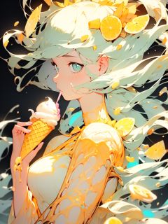 1girl, holding ice cream in her hand, with excellent detail handling,A glass of lemon juice in the background,Handle hand details in place,nijistyle,MG tian,Cream hair, cream clothes, melt, <lora:EMS-4020-EMS:1>
