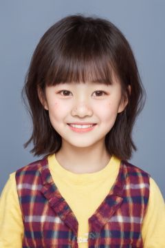ID photo, (a 5-year-old girl: 1.5), solo, upper body, a small Asian girl with short hair, chubby, (beauty mole: 1.5), plaid vest. He smiles at the camera, (yellow solid background: 1.5), blue_IDphoto