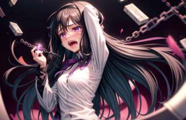 masterpiece, best quality,bp-homura, 1girl, akemi homura, long hair, purple eyes, black hair, solo, chain, hairband, tears, open mouth,(kbxll:0.4)
