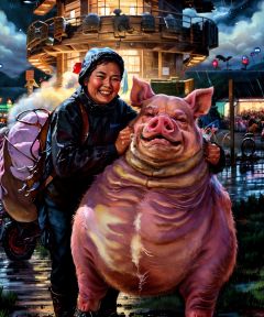 best quality, masterpiece, highres, giant pig, evil smile, night,rainy,  village, building, <lora:CN60S-V2:0.85>