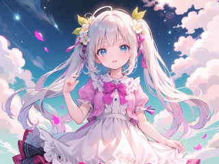 masterpiece, best quality, (loli),  upper body,frilled dress, long hair, twintails, bowtie, beautiful eyes, shamed, dynamic angle,, flower patterned dress