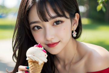 masterpiece,best quality,detail,1girl, solo, food, puiple hair, realistic,long hair, looking at viewer, ice cream, blurry, holding, blurry background, red nails, bangs, lips, brown eyes, closed mouth, red lips, portrait, nail polish, hair ornament, ice cream cone, smile, holding food, close-up, depth of field,off-shoulder