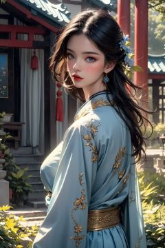 best quality, masterpiece, (photorealistic:1.4), <lora:tpqy:1>1girl,realistic,tpqy,dramatic lighting, from below,Light blue clothes,look back,golden flowers on the clothes