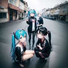 (anime irl:1.3), 3girls, miku, multiple girls, adidas, black tracksuit, striped, squatting, from above, street, from side<lora:Anime IRL Russia_633570:1.25> <lora:Hatsune Miku_558094:1>