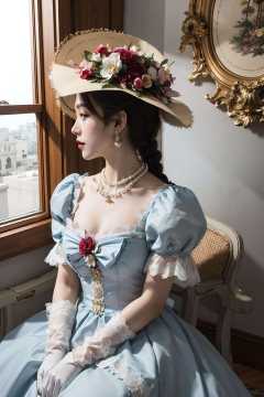1girl, dress, gloves, jewelry, necklace, pearl_necklace, solo, white_dress, black_hair, hat, sitting, closed_mouth, braid, flower, earrings, puffy_sleeves, indoors, white_gloves, dark_skin, dark-skinned_female, window, profile, lace_trim, lace, sun_hat, hands_on_lap, lace_gloves, victorian <lora:vic:0.8>