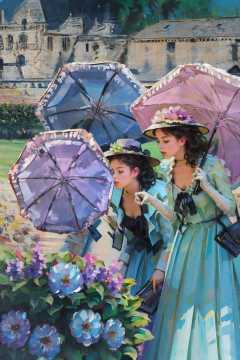 flower, holding, holding_umbrella, hydrangea, oil-paper_umbrella, painting_\(medium\), parasol, rain, red_umbrella, shared_umbrella, snail, traditional_media, transparent_umbrella, umbrella, watercolor_\(medium\), 1girl, solo, brown_hair, long_sleeves, hat, dress, closed_eyes, bag, white_dress, profile, leaning_forward, blue_dress, pink_flower, purple_flower, impressionist <lora:impress:1>