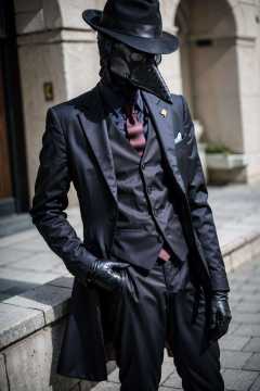 black_headwear, blurry, formal, hat, suit, tiles, solo, shirt, gloves, 1boy, holding, jacket, male_focus, necktie, black_gloves, pants, black_jacket, mask, black_pants, fedora, black_suit, Plaguecore, outfit <lora:Plaguecore:0.7>