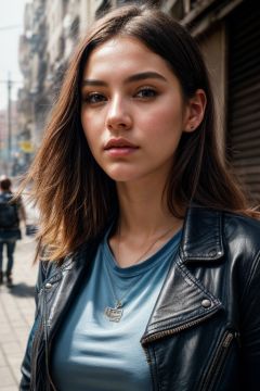 photo of extremely sexy (AM190_Brigitte:0.99), a woman as a sexy student, ((closeup portrait:1.3)), modelshoot style, (extremely detailed CG unity 8k wallpaper), photo of the most beautiful artwork in the world, professional majestic oil painting by Ed Blinkey, Atey Ghailan, Studio Ghibli, by Jeremy Mann, Greg Manchess, Antonio Moro, trending on ArtStation, trending on CGSociety, Intricate, High Detail, Sharp focus, dramatic, photorealistic painting art by midjourney and greg rutkowski, (blue t-shirt:1.2), (leather jacket), (jeans), ((city slums)), (looking at viewer:1.2), (detailed pupils:1.3), (holding a shopping bag:1.1)