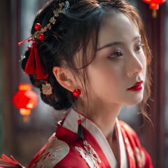 Realistic style, close-up, a beautiful woman wearing a Hanfu, with a slightly melancholic face, a red dot on the forehead, exquisite hair accessories, exquisite patterns, indoor, side lighting, film texture, high-quality, masterpiece, 8K