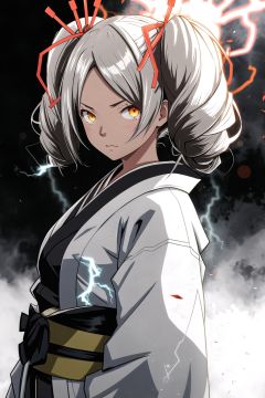 guiltys, serious, a girl, kimono on, gray twintails hair, posing, upper body, proud, (bokeh:1.1), depth of field, style of Anne Bachelier, tracers, vfx, splashes, lightning, light particles, electric, white background, fog, steam,hyperanim