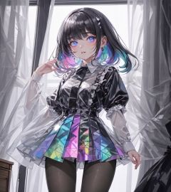 transparent color PVC clothing,transparent color vinyl clothing,prismatic,holographic,chromatic aberration,fashion illustration,masterpiece,girl with harajuku fashion,looking at viewer,beautiful eyes,8k,ultra detailed,pixiv,upper body,Black silk,Black pantyhose,