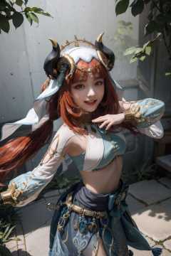 masterpiece, best quality, <lora:nilou:1>,nilou \(genshin impact\), horns,red hair,long hair,twintails,veil,aqua eyes,harem outfit,neck ring,jewelry,bare shoulders,long sleeves,crop top,brooch, bracer, gold trim,blue skirt,circlet,vision \(genshin impact\), smile,dancing,