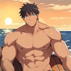 1boy,A sturdy man basking in the sun by the sea,black hair,blue_eyes,muscler,topless,mature male,stubble,dark_skin,upper_body,