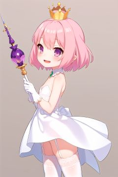 (petite:1.2),1girl,solo,standing,short hair,pink hair,ahoge,purple eyes,upper body,fancy dress,open mouth,smile,upper body,from side,(crown),(jewelry),(magic wand),white gloves,white thighhighs,garter belt,, <lora:EMS-4706-EMS:0.8>