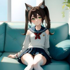 ,indoors,couch,on couch,star \(sky\),(school uniform ,sailor collar, ,skirt,white thighhighs :1.1) ,arms behind back,(sitting:1.1)
