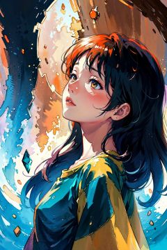 1 woman, crystals rays of lights refraction surreal orange and purple Alberto Seveso (masterpiece, photorealistic) (best quality) (dramatic lighting ) (sharp focus),exposure blend, medium shot, bokeh, (hdr:1.4), high contrast, (cinematic, teal and orange:0.85), (muted colors, dim colors, soothing tones:1.3), low saturation,(watercolor style:1.5)